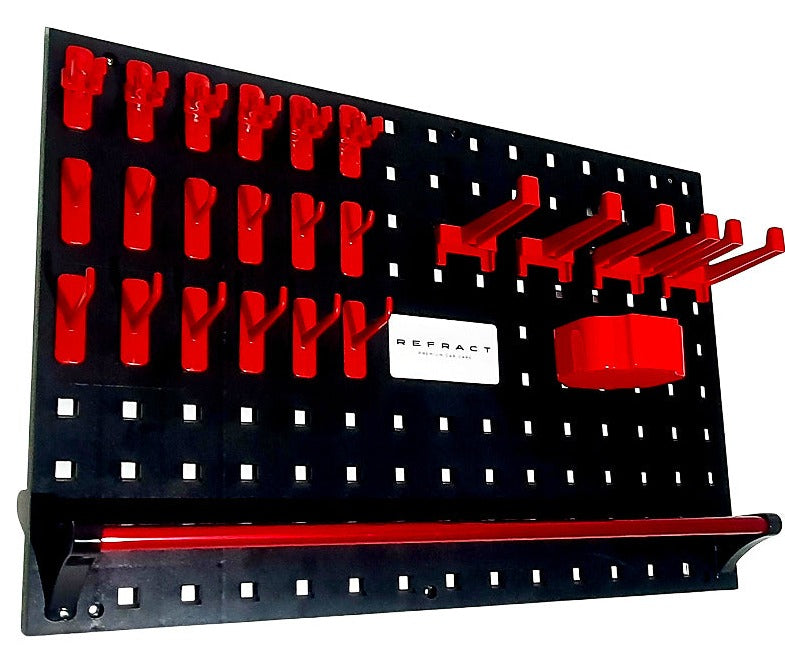 The new Refract Garage Wall Hook storage Boards with heavy duty fixings, rails & bins will not only make your garage, van or detailing studio look Professional but hugely increase your efficiency & attention to detail!